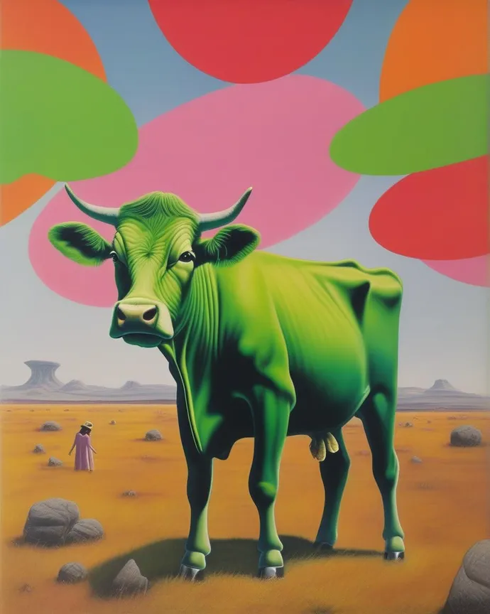 Fashion models in a field of shapes with weird fashion and alien landscape. Lots of colors and textures. A floating green cow. Richard prince painting