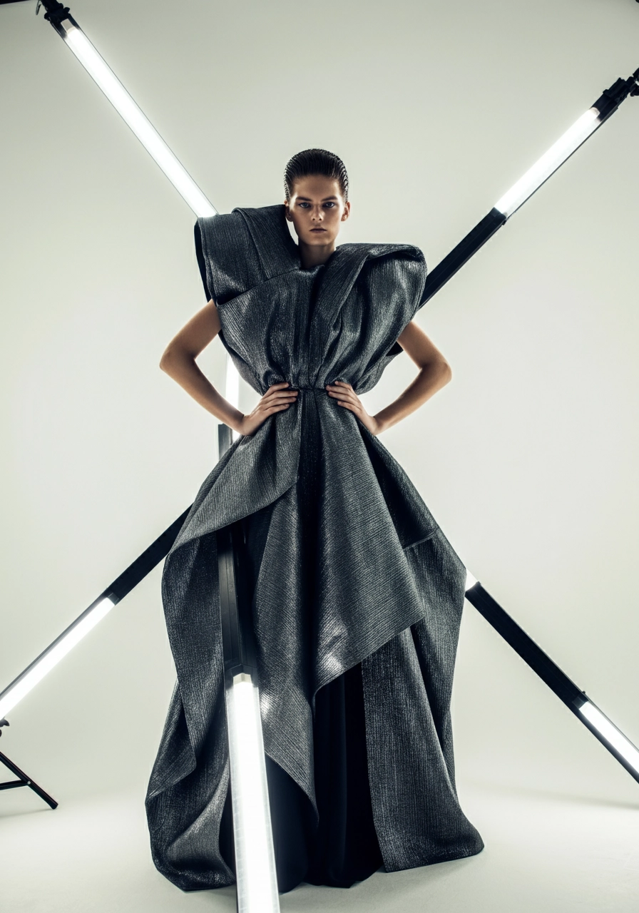 A model wearing an avant-garde, metallic silver gown strikes a bold pose in a minimalist studio setting. The lighting is sharp, creating dramatic contrasts and highlighting the intricate textures and futuristic design of the gown. The background is a clean white, emphasizing the model and her outfit. Her pose is angular and fierce, with a focus on the sharp lines of the dress and her confident expression. The overall tone is modern, sleek, and avant-garde, showcasing high fashion with a bold and artistic flair.