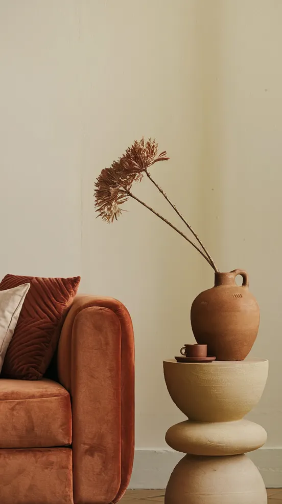 A cozy interior setting featuring a plush, rust-colored velvet sofa with a beige pillow accent. Beside it, a sculptural wooden side table holds a matte earthenware vase with dried flowers and a small cup and saucer. The background is a muted cream wall, and the flooring is a light wood. The color palette is warm and earthy, with soft, diffused lighting creating a calm and inviting atmosphere. The composition is balanced, with a side view focusing on the harmonious blend of textures and shapes, conveying a serene and stylish ambiance.