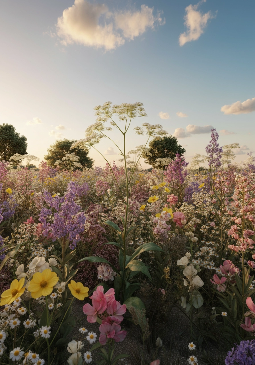 A meadow filled with pastel pink, lilac, white and yellow wild flowers and a soft summers evening. 3D illustration