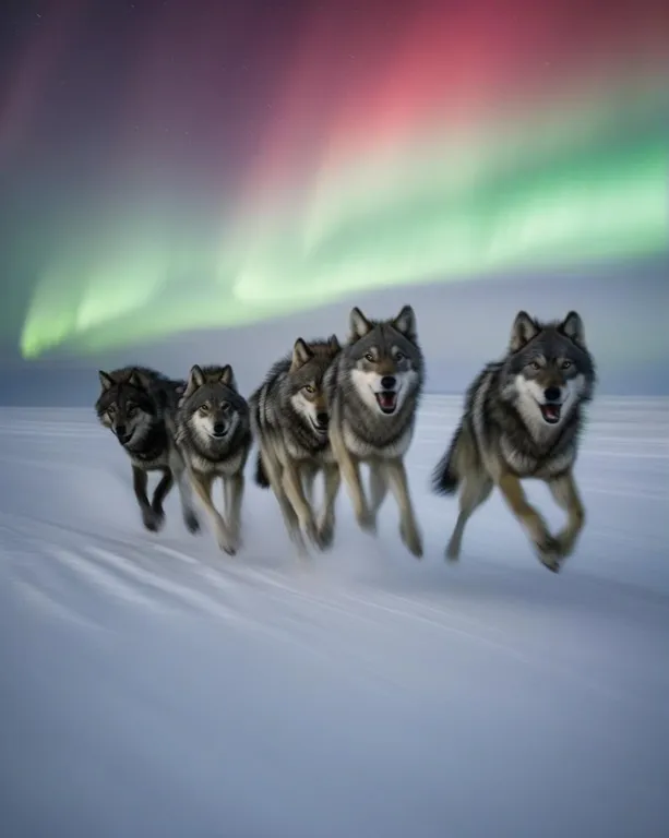 a pack of majestic wolves running through an icy tundra, underneath the northern lights