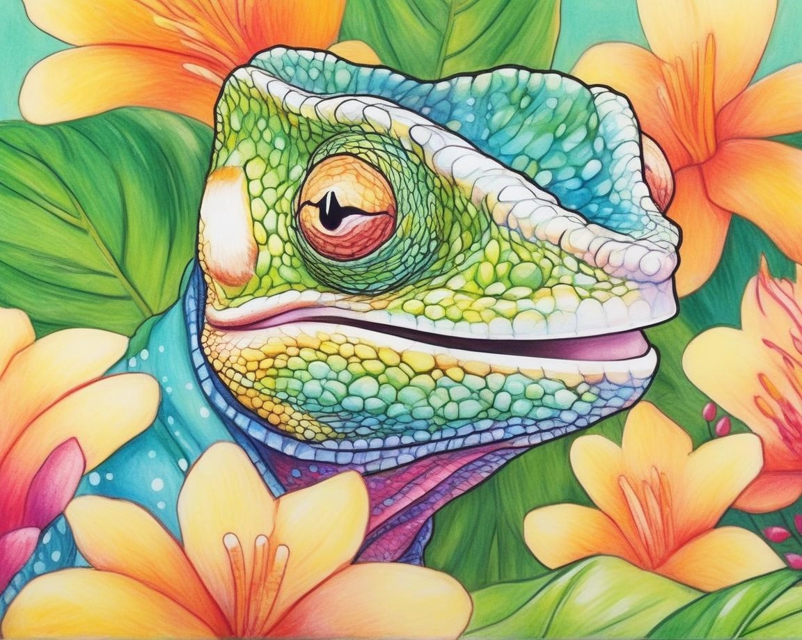 A smiling Chameleon on a white background amidst vibrant tropical flowers