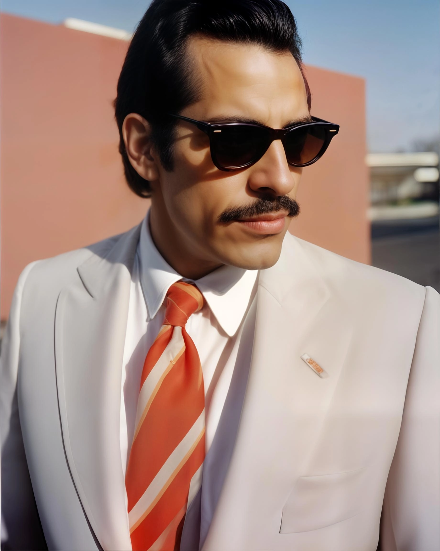 A retro hispanic man dramatic profile with sunglasses in office suit with red and pastel orange colors .