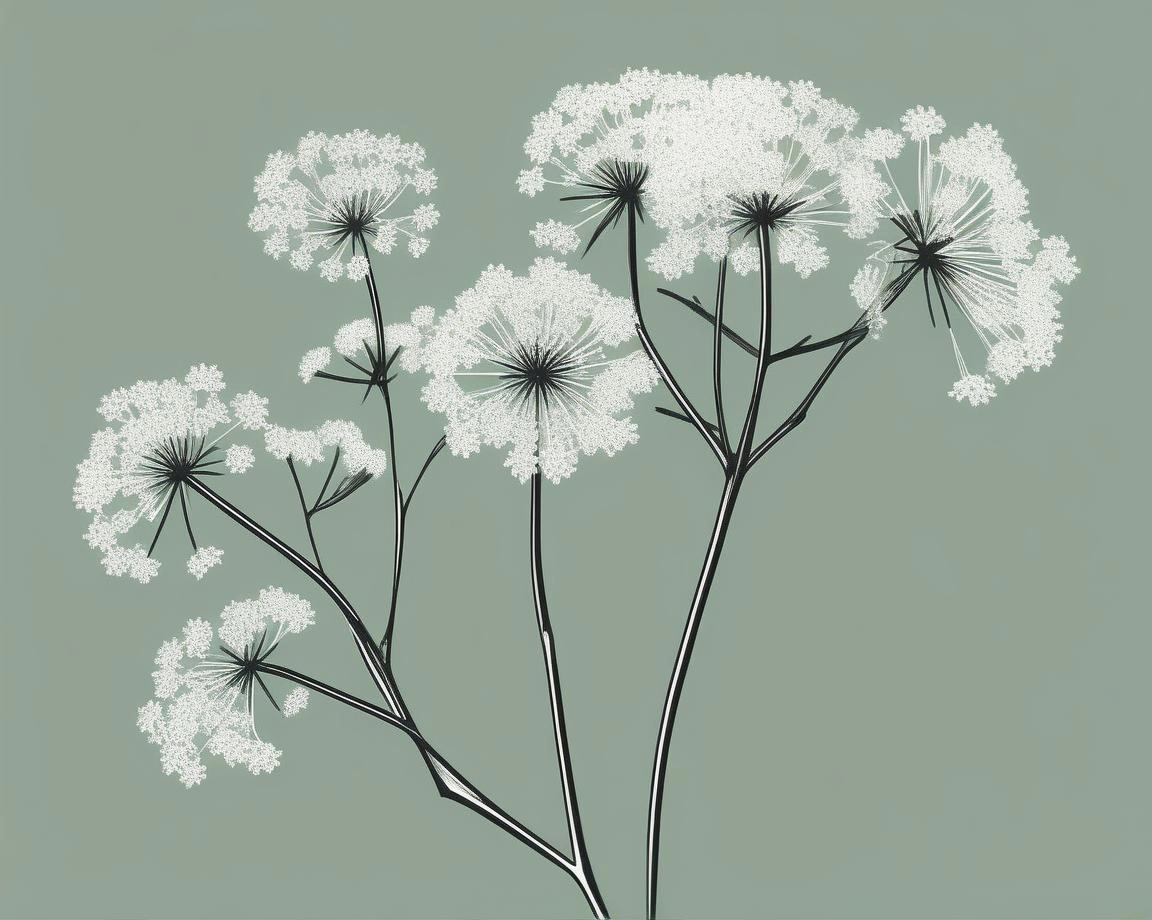 zoom in very, very close-up on a sparse branch of assorted queen anne's lace rendered in a traditional Japanese style