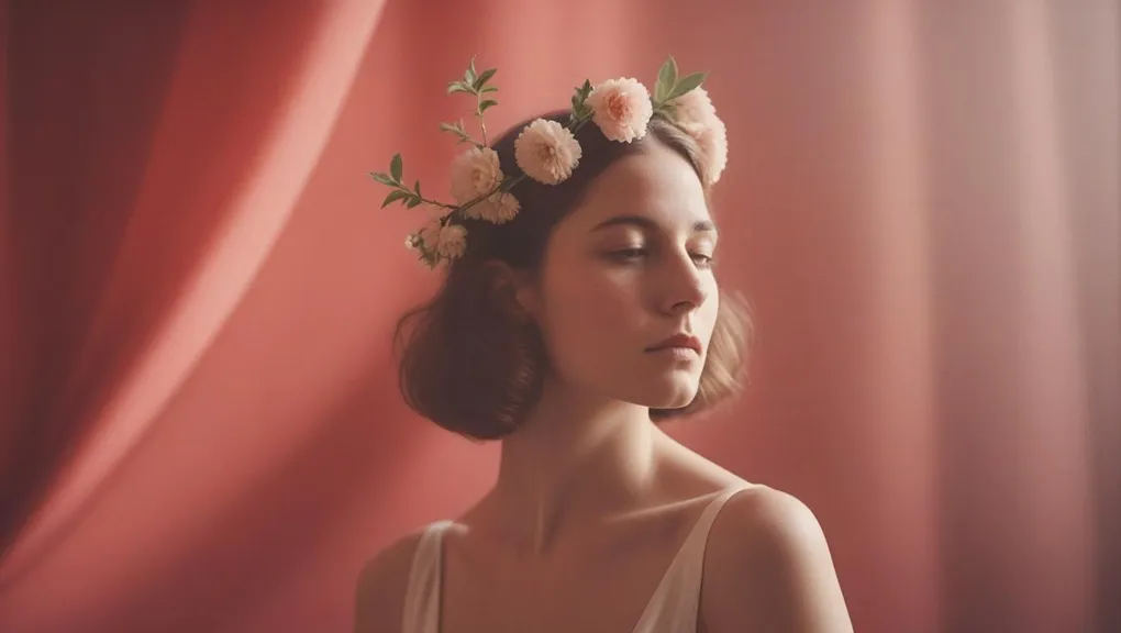 Minimalist profile of a young woman standing against a theater stage, muted and virtually invisible except for the red velvet of the curtain. The woman covers her face with a theatrical mask and her face is almost invisible. Her hair is composed of flowers and small leaves, making it seem as if her hair is branches of trees and flowers. The overall composition gives the image a mysterious, theatrical character, indicating a deep connection between the actress and art. Illustration, painting, photography.