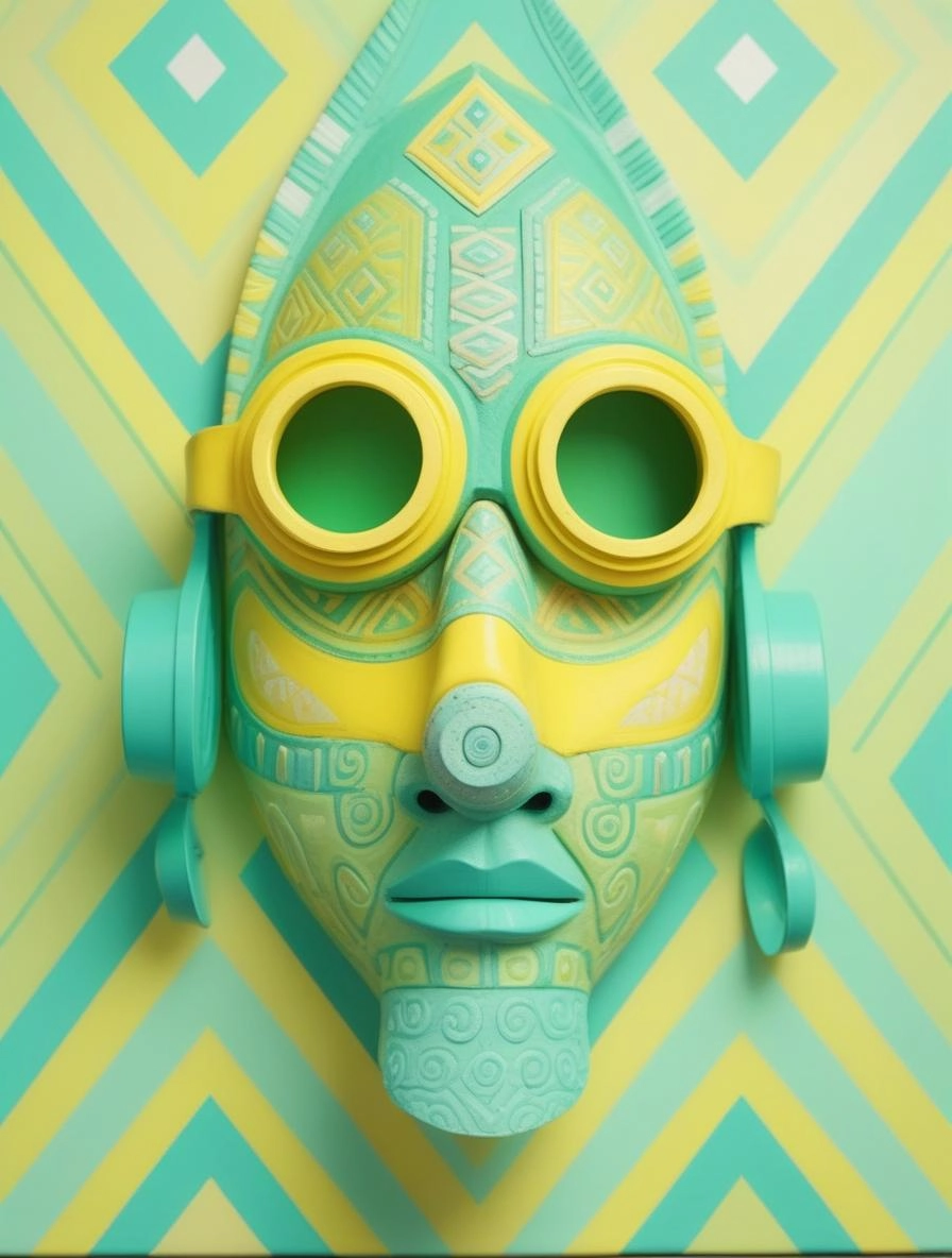 front view close up 3d render of a stylized retro futuristic tribal Alebrije mask portrait with quirky goggles and colorful elaborate geometric patterns, Cameleon
