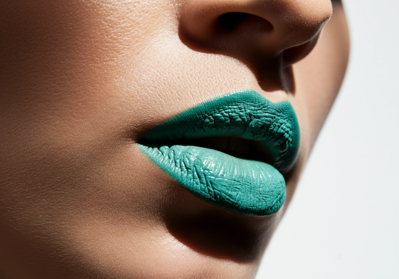 Extreme close-up of a model’s lips with bold, vibrant aqua green lipstick in a matte, velvety texture. The lighting is dramatic, casting subtle highlights on the nose and areas of the skin, emphasizing the texture of the lipstick and the softness of the skin. The composition is intimate and high-fashion, focusing solely on the lips and part of the nose, evoking a sense of bold style and modern beauty aesthetics, beauty photo. Background is a warm white color.