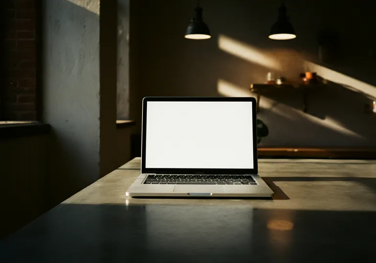 Macbook pro with a white screen on a polished concrete desk in a minimalist office setting with dappled lighting
