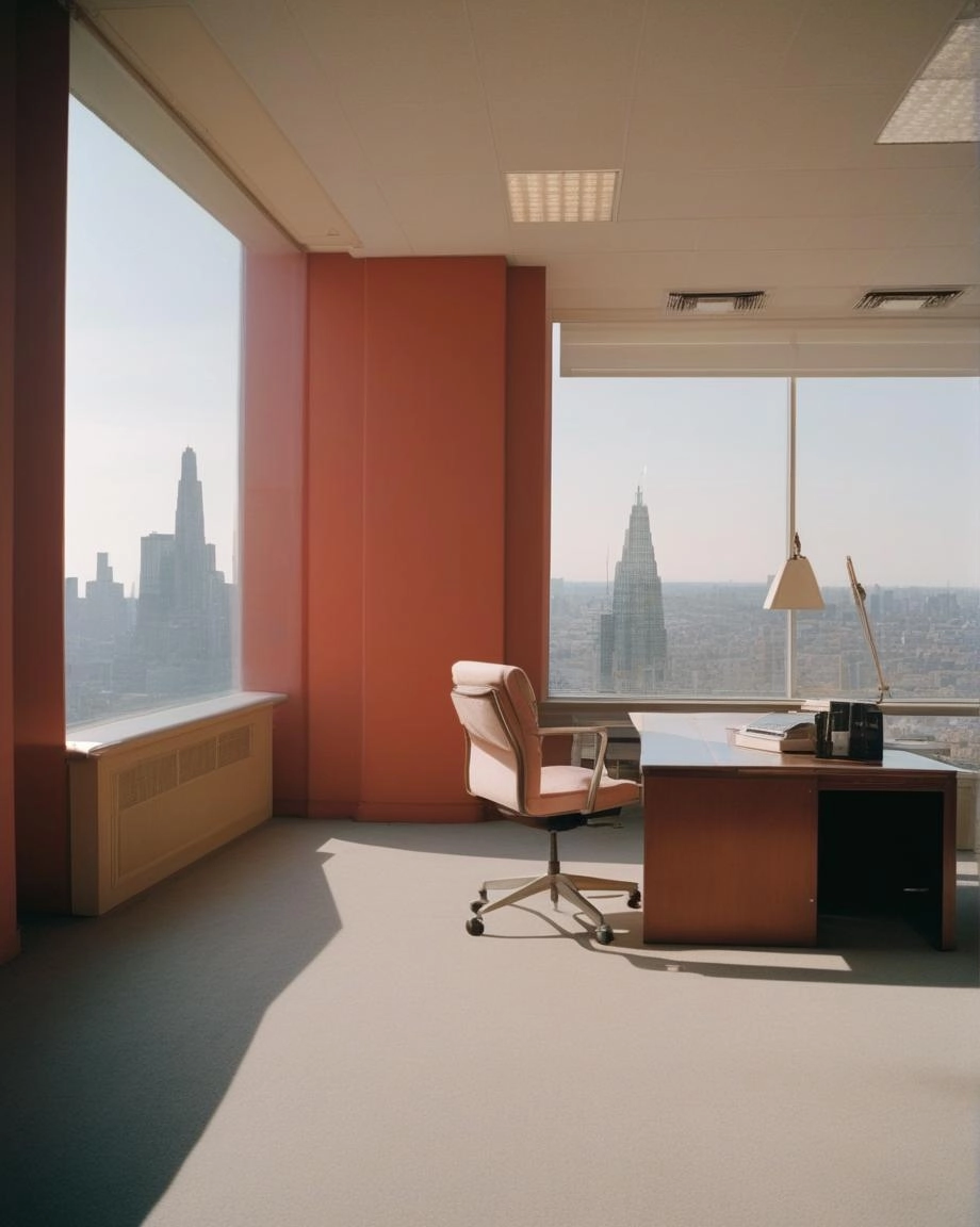 A red and pastel orange retro inspired office overlooking a cityscape.