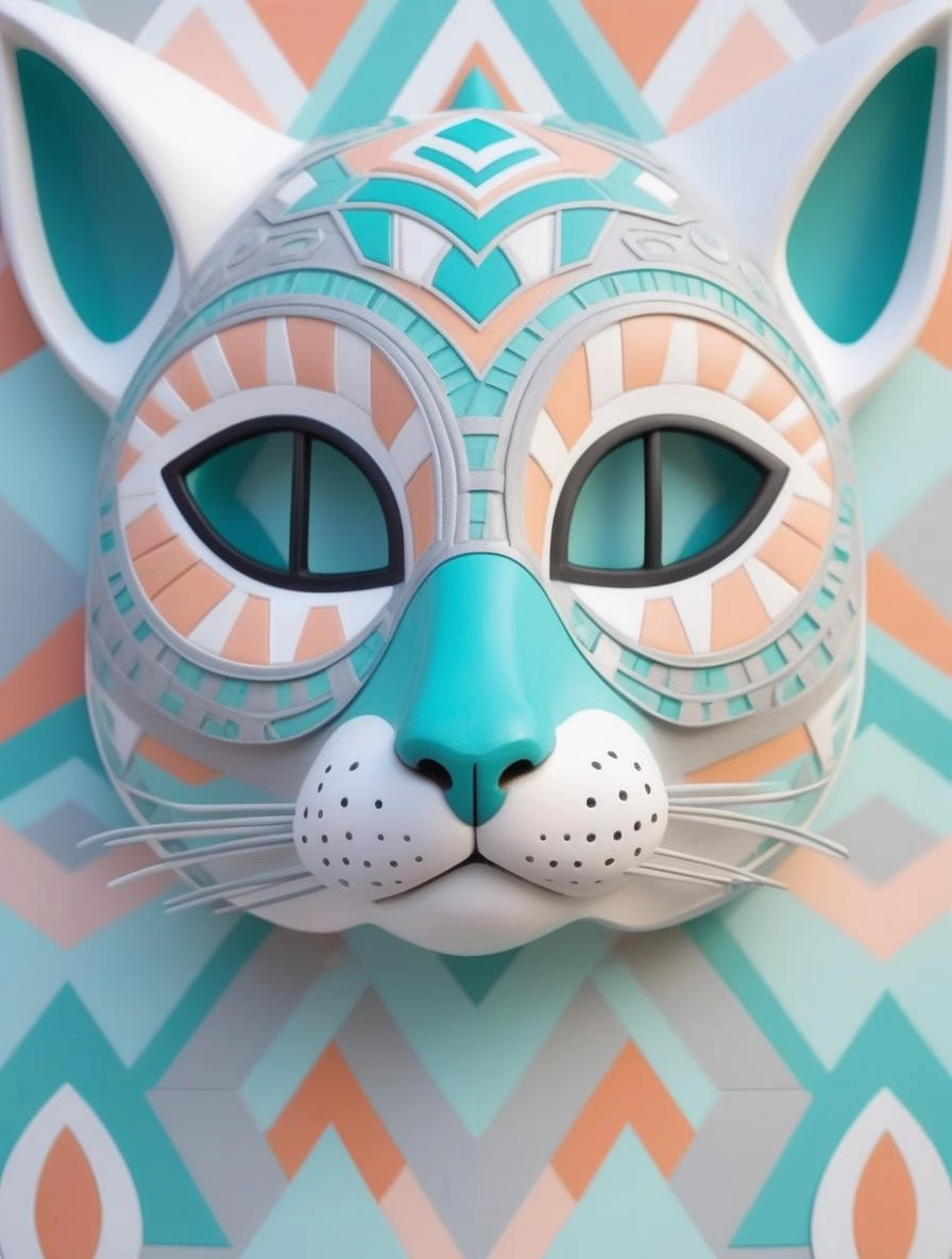 front view close up 3d render of a stylized retro futuristic tribal Alebrije mask portrait with quirky goggles and colorful elaborate geometric patterns, Cat
