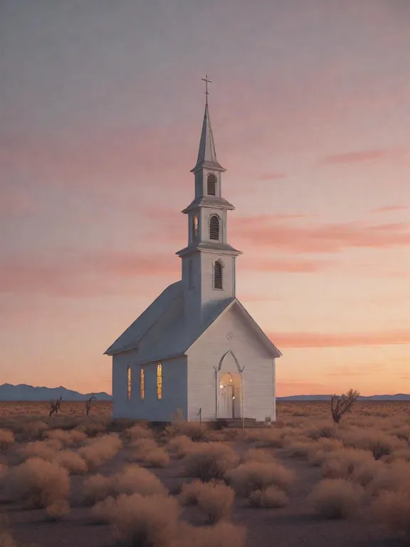 a white steeple church in the old west at twilight with dusty tumbleweeds rolling