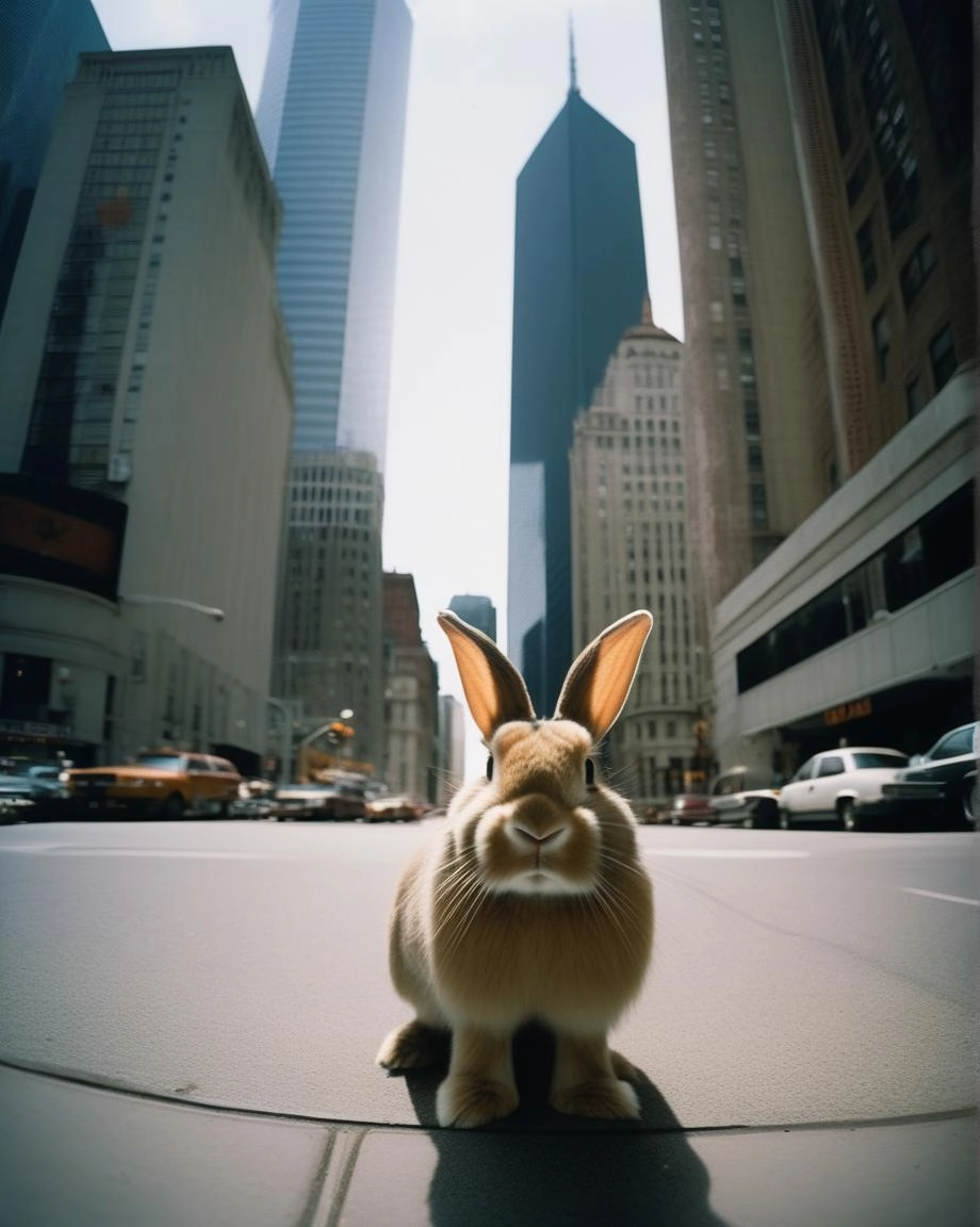 a realistic giant lop bunny walking upright through a busy city with skyscrapers in the style of fuji film and kodak portra 400, '70s style ads