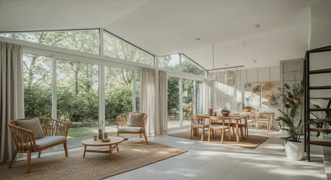 Create a modern sunroom that blends indoor comfort with outdoor beauty, consistent with the Coisoteca brand. Utilize a neutral color palette with whites, soft grays, and natural wood tones to create a bright and inviting space. Incorporate large windows or glass walls to allow abundant natural light and offer panoramic views of the surrounding landscape. Add comfortable seating such as a sleek sofa or a pair of modern chairs with plush cushions in subtle colors, arranged around a minimalist coffee table. Use natural materials like wood or wicker for furniture to enhance the connection with nature. Include indoor plants or a vertical garden to bring greenery into the space and add a touch of nature. Use light, airy curtains or blinds to control the amount of sunlight and maintain privacy when needed. Incorporate subtle lighting fixtures such as floor lamps or recessed lighting to create a warm and cozy ambiance in the evenings. Add decorative elements like a simple rug, a few pieces of abstract artwork, or a stylish throw to personalize the space while keeping it uncluttered and elegant. Ensure the sunroom feels spacious, serene, and perfectly designed for relaxation and enjoying the beauty of the outdoors from the comfort of home.