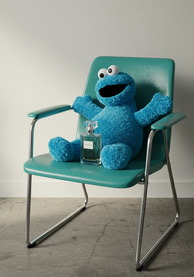 A hyperrealistic still-life scene shot with soft natural light and a 50mm lens. Centered in the frame is a vintage turquoise fiberglass armchair with chrome legs, placed against a plain off-white wall on a raw concrete floor. A clear glass perfume bottle sits on the middle of the chair seat. The bottle is elegant, and luxurious — with a heavy glass base and a sculptural cap, but no text or branding. Behind the bottle, slumped casually in the chair, is a plush Cookie Monster toy. The toy is significantly larger than the bottle and taking up most of the seat — and looks soft, textured, and oversized with its head tipped sideways, leaning against the inner curve of the chair’s armrest. Its arms and legs are flopped naturally, as if it had been left there and slid into that position on its own. The setup feels unstyled and poetic — a luxurious object juxtaposed with a soft, goofy toy. No human elements or other props in frame. Realistic light, clean shadows, detailed surface textures, and a balance of fashion elegance with offbeat humor.