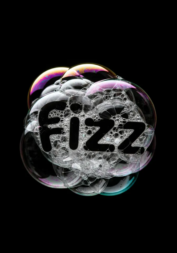 A cluster of transparent, reflective soap bubbles interconnected, floating against a black background. The bubbles display a smooth, glossy texture with subtle reflections and a few small specks inside. The composition is centred, capturing the delicate and ethereal quality of the bubbles. The lighting is soft and even, highlighting their fragility and translucence, creating a serene and whimsical atmosphere. The bubbles are position a a way that forms the words FiZz in Futura black italic .