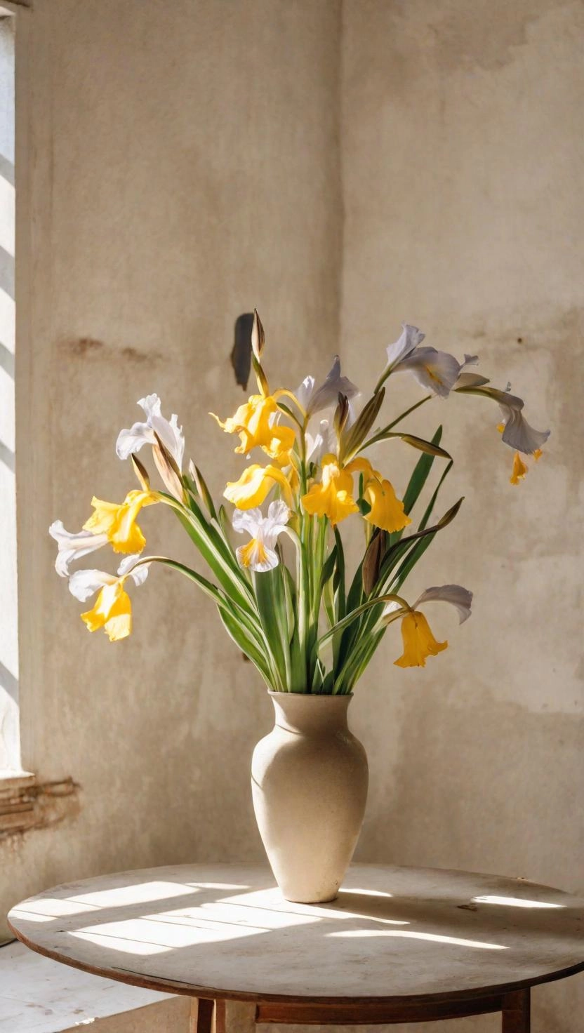 Warm sunlight filtering through an abandoned house interior with a vase of irises on a table