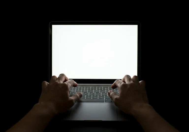 Two hands typing on a macbook pro with a brightly lit, blank screen in a dark environment. The macbook's screen casts a stark white light, illuminating the hands and creating high contrast against the pitch-black background. The composition focuses on the macbook and hands, with the screen as the central point, framed symmetrically from a front perspective. The mood is minimalistic and mysterious, emphasizing the isolation of the device and the darkness surrounding it.