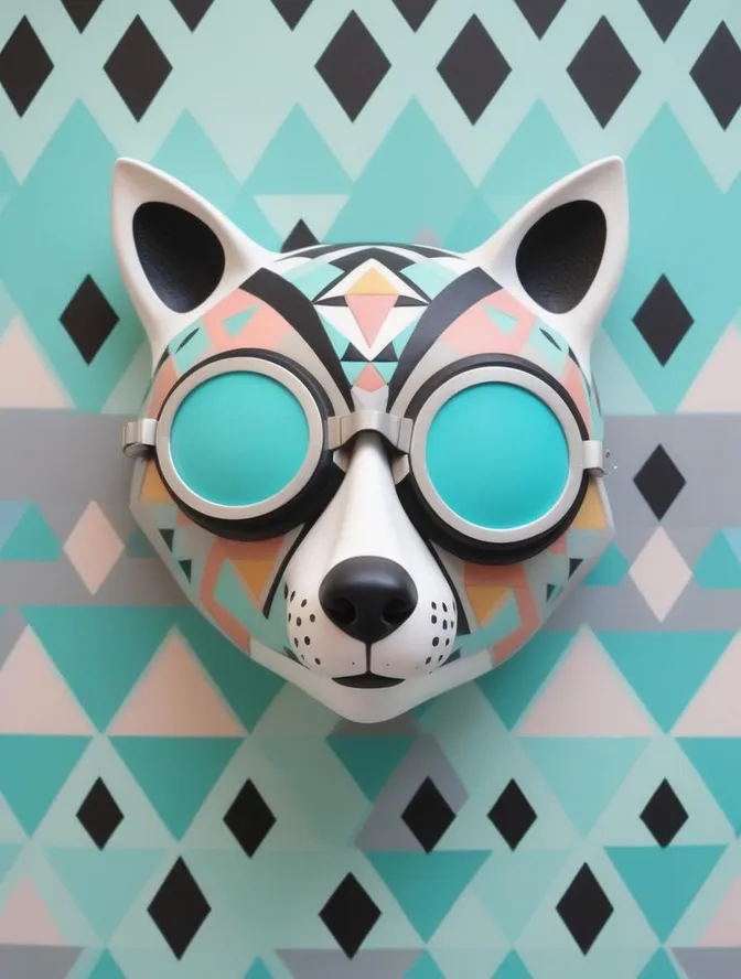 front view close up 3d render of a stylized retro futuristic tribal Alebrije mask portrait with quirky goggles and colorful elaborate geometric patterns, Racoon