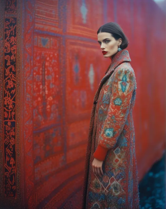 A captivating fashion portrait of a model donning an enchanting coat inspired by a Persian carpet. The coat is adorned with vibrant colors and intricate patterns, elegantly shaping its form. The model, with red lips and a soft, glowing expression, sits near the sea under a heavy rain. The minimalistic backdrop is white, while the cinematic atmosphere captures energy and motion. The image was artfully shot with a Sony A7 and a 50mm lens in 4k resolution at f6.0, mirroring the style of Sofia Lind in a fashion editorial setting., portrait photography, cinematic, fashio