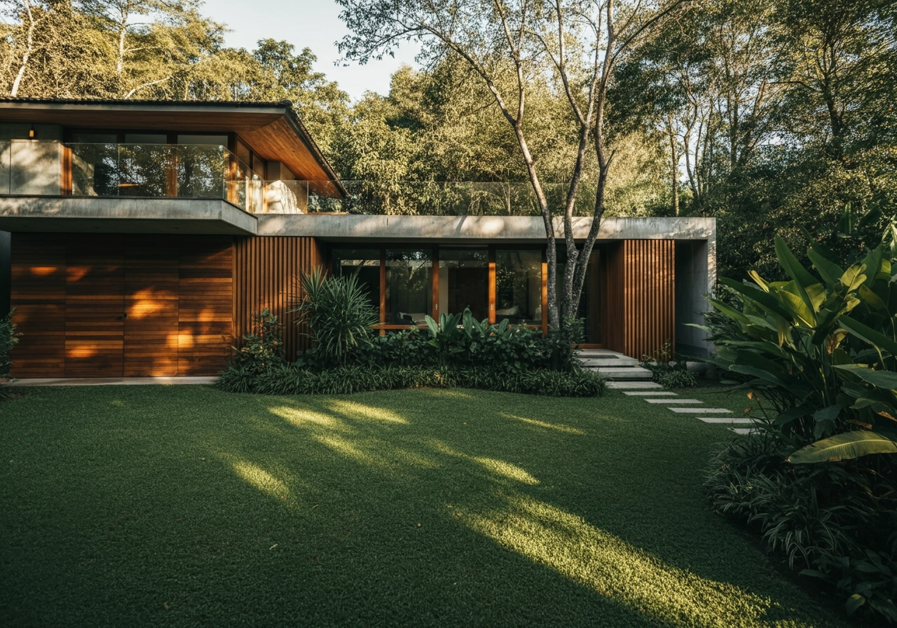 A beautifully designed modern home nestled among lush greenery, featuring raw concrete, warm wooden paneling, and large floor-to-ceiling windows. The sunlight creates soft organic shadows, and the house has an inviting, minimalistic feel with a natural color palette of muted yellows, greens, and warm neutrals. The landscaping is serene, with a mix of structured plants and free-flowing greenery, blending seamlessly into the environment. The atmosphere is airy, peaceful, and aspirational, evoking the perfect blend of sophistication and nature.