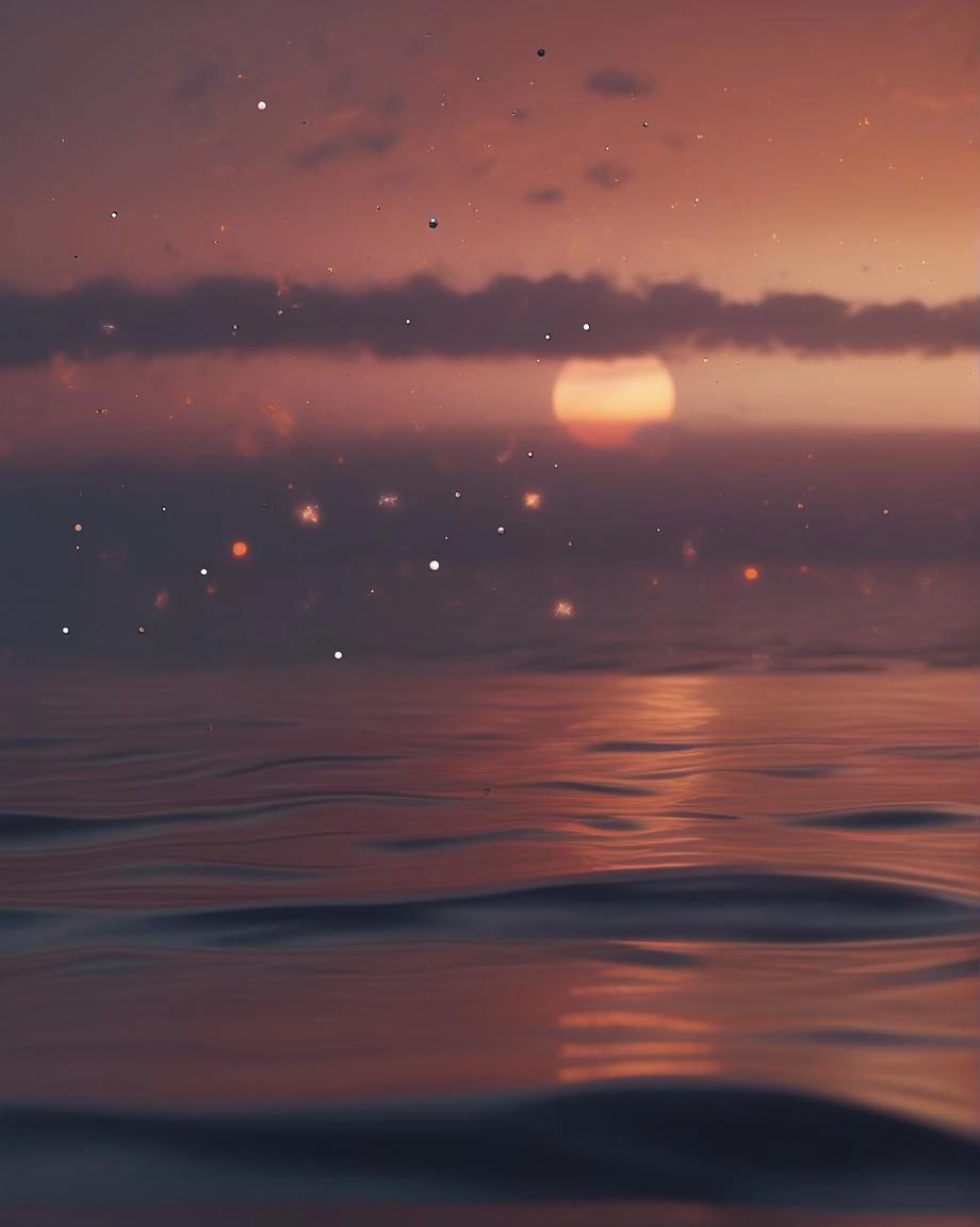 a moody cloudy sky with distant stars and planets at sunset reflecting on calm ocean waters