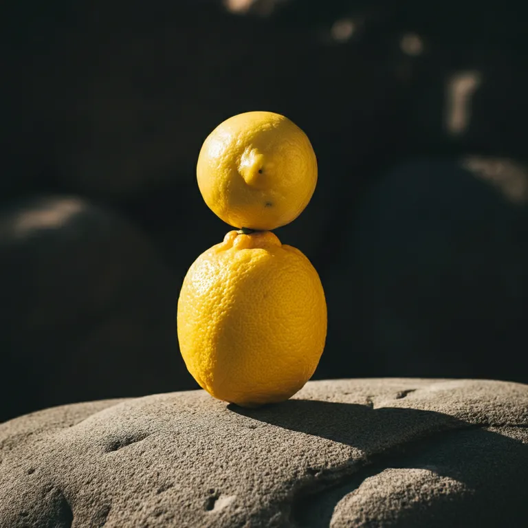 a lemon balanced on a rock, editorial minimalism, soft focus, shallow depth of field, natural sunlight, moody natural light, 35mm film grain, vintage color grading, clean composition, subtle overexposure, balanced symmetry
