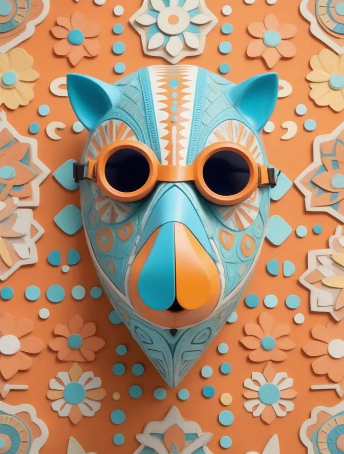 front view close up 3d render of a stylized retro futuristic tribal Alebrije mask portrait with quirky goggles and colorful elaborate geometric patterns, Badger