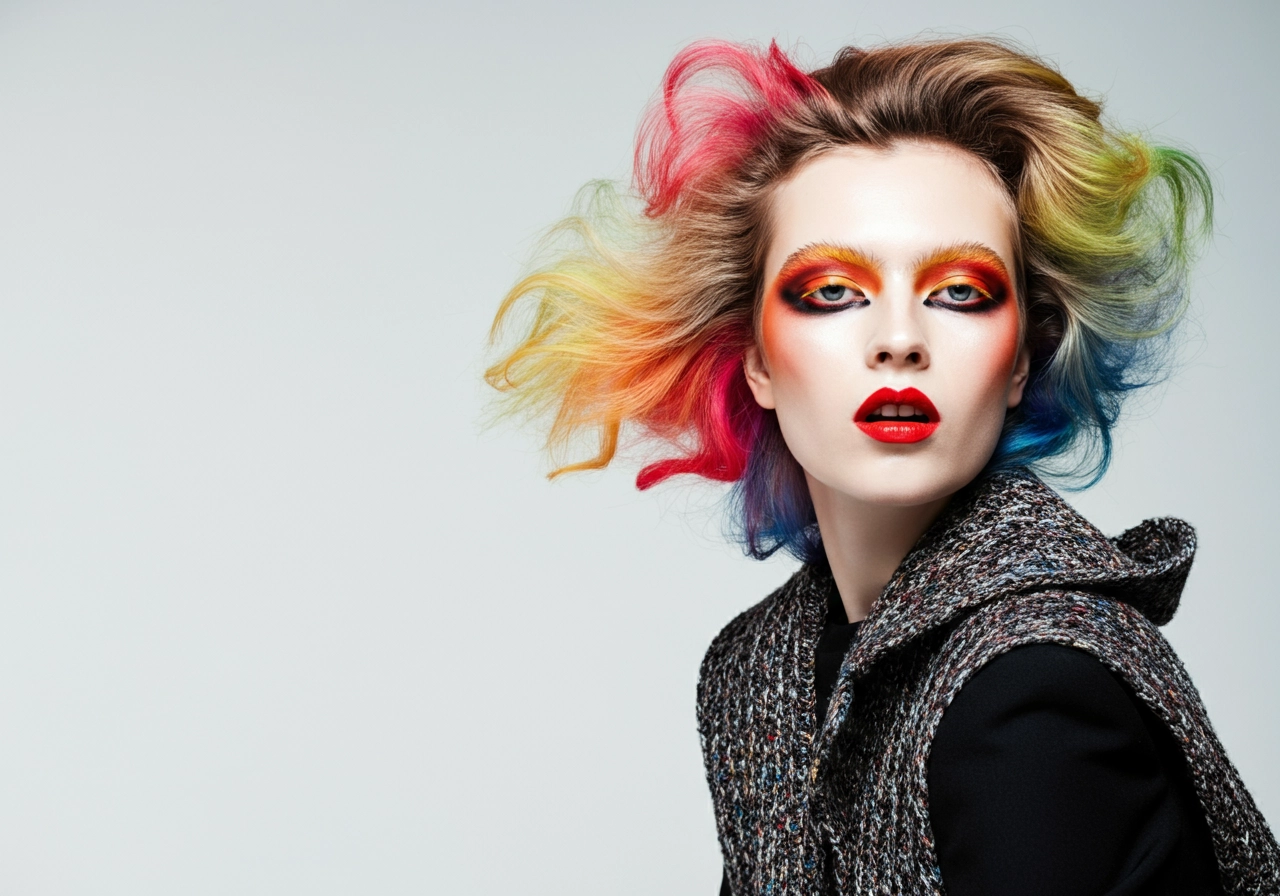 Photo of a model, studio shot, high contrast colors, white color background, realistic photo, magazine cover, fashion shoot, realistic skin, minimal makeup, colorful hair