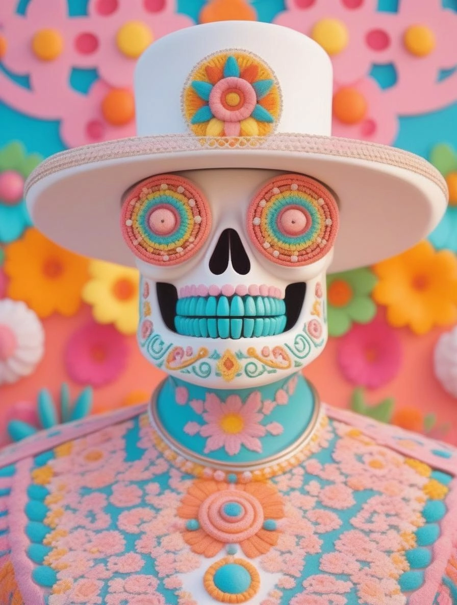 SHOOTING A GUN AT THE CAMERA, 3d portrait render of a retro futuristic MEXICAN SUGAR SKULL ROBOT HUICHOL WITH SOMBRERO, GIANT HEAD NARCO ROBOT WITH A GUN, SHOOTING A GUN TOWARDS THE CAMERA, wearing quirky goggles and elaborate traditional Mexican mariachi Attire, clothing has Mandelbrot Fractal embroideries, against a Vibrant royal blue and white background with rainbow accents and rays of light