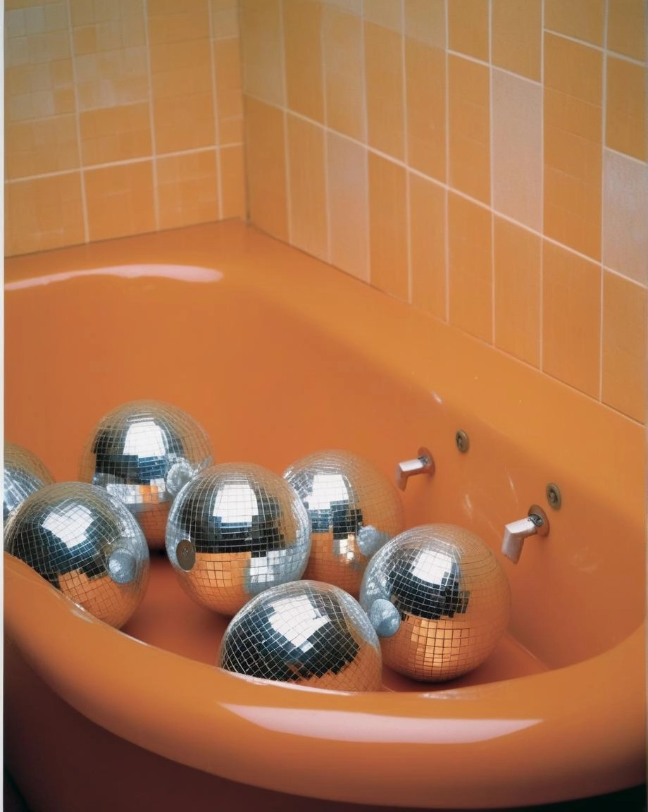 disco balls in a bathtub, a monochromatic orange bathroom, '70s style ads