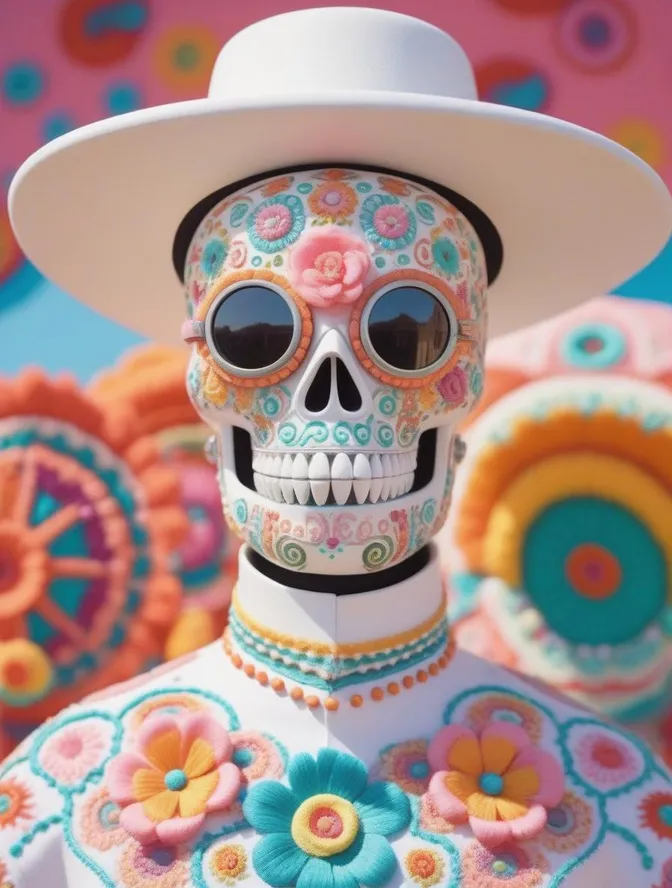 SHOOTING A GUN AT THE CAMERA, 3d portrait render of a retro futuristic MEXICAN SUGAR SKULL ROBOT HUICHOL WITH SOMBRERO, GIANT HEAD NARCO ROBOT WITH A GUN, SHOOTING A GUN TOWARDS THE CAMERA, wearing quirky goggles and elaborate traditional Mexican mariachi Attire, clothing has Mandelbrot Fractal embroideries, against a Vibrant royal blue and white background with rainbow accents and rays of light
