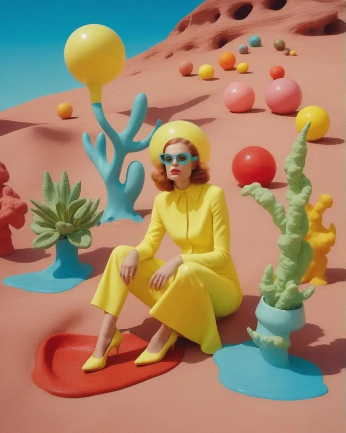 Alien landscape with blown glass and toys and plastic plants. Models wearing weird fashion. Yellow, blue and green and red and ruby. Surreal painting. Style of de Kooning and 60s art.