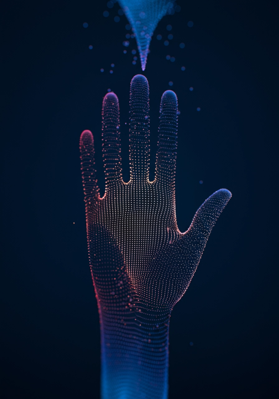 Abstract digital wave dots background with gradient color and hand shape technology concept design for banner or poster on dark blue background Generative AI