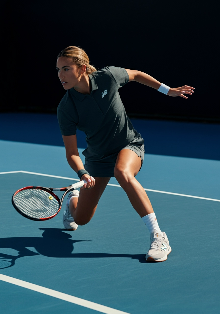 A cinematic editorial image of a single athlete in motion on an outdoor blue Australian Open-style tennis court, holding a tennis racket mid-action. The athlete is captured in a dynamic pose—lunging, pivoting, or preparing to hit—showcasing speed, balance, and power. The focus is on New Balance sneakers gripping the court, with subtle motion blur to convey movement and energy. The athlete wears a modern New Balance tennis-inspired outfit—performance polo and shorts or skirt—styled for both sport and lifestyle. Composition is angled for a dynamic perspective, highlighting athletic form, apparel movement, and racket position. Lighting is natural and sunlit, with soft shadows emphasizing texture, muscle definition, and fabric detail. The mood is cinematic and editorial: a mix of athletic intensity and fashion-forward styling. Inspired by Jacquemus, Kith, Aime Leon Dore, and Casablanca Paris style campaigns.